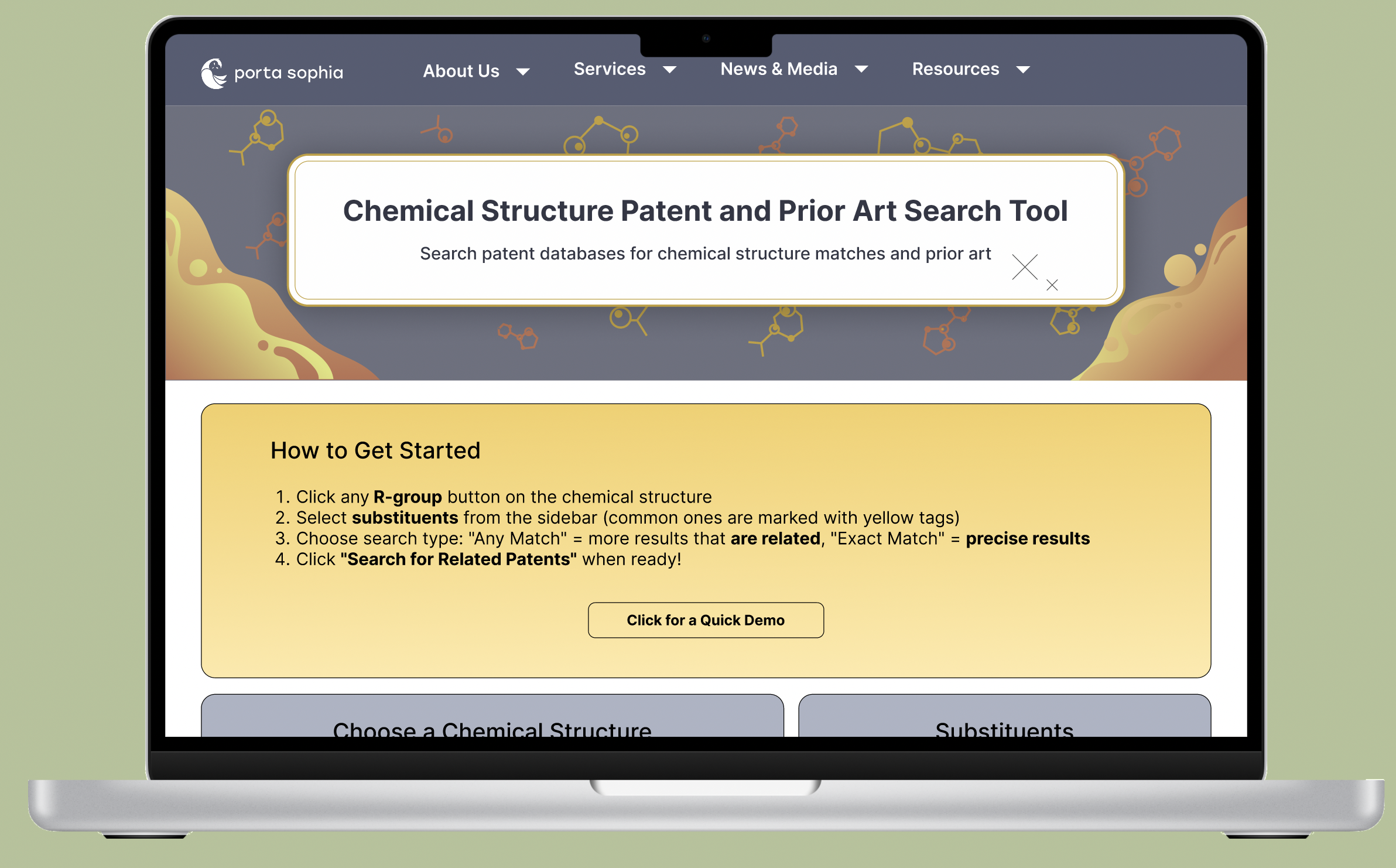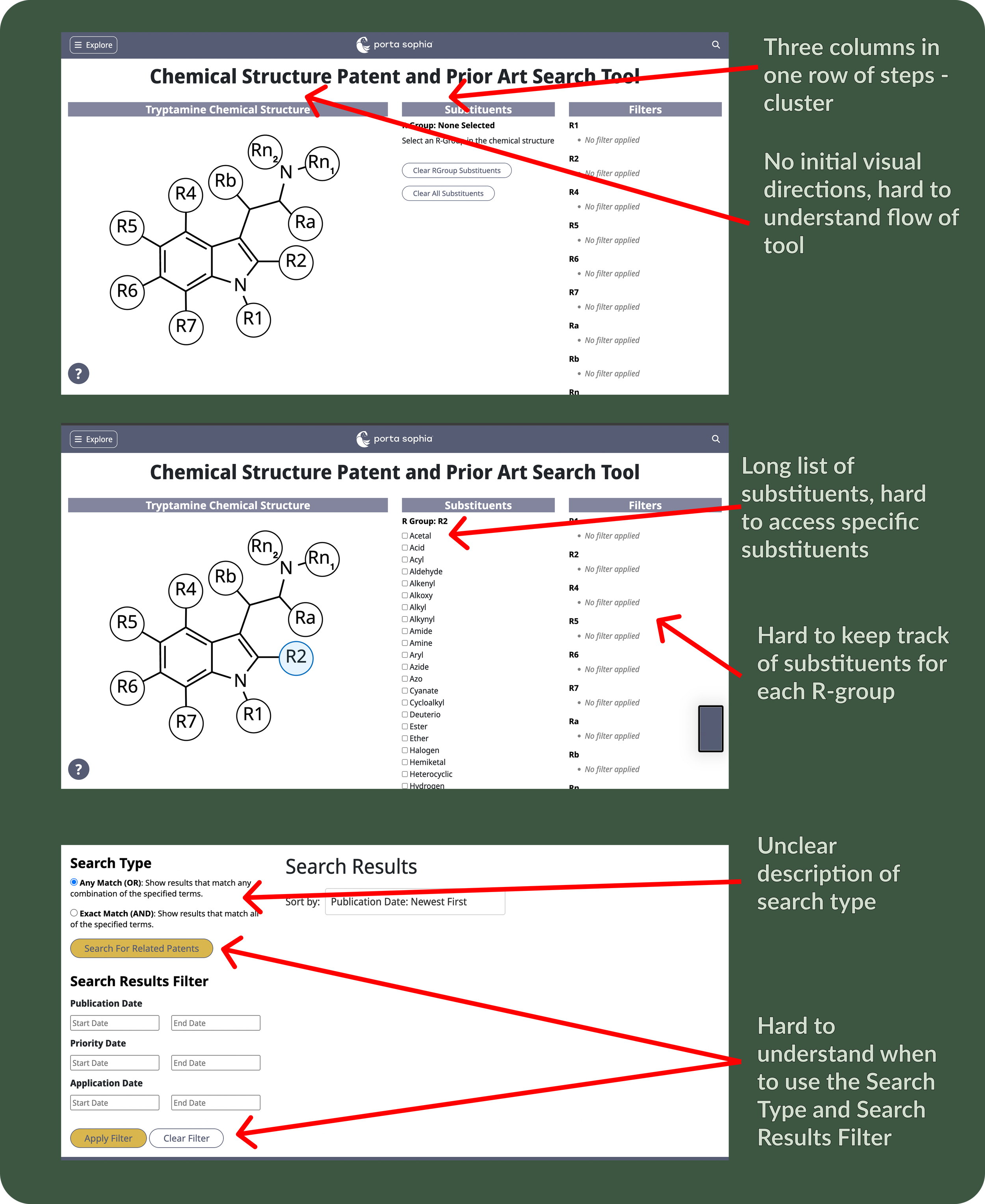 Porta Sophia is a prior art library focused on psychedelic-related patents. The search tool enables researchers to explore substituents, scaffolds, and related patents, but at the time, poor onboarding, ambiguous filters, and limited visibility of options created friction for users. This impacted user engagement and the overall utility of the platform.