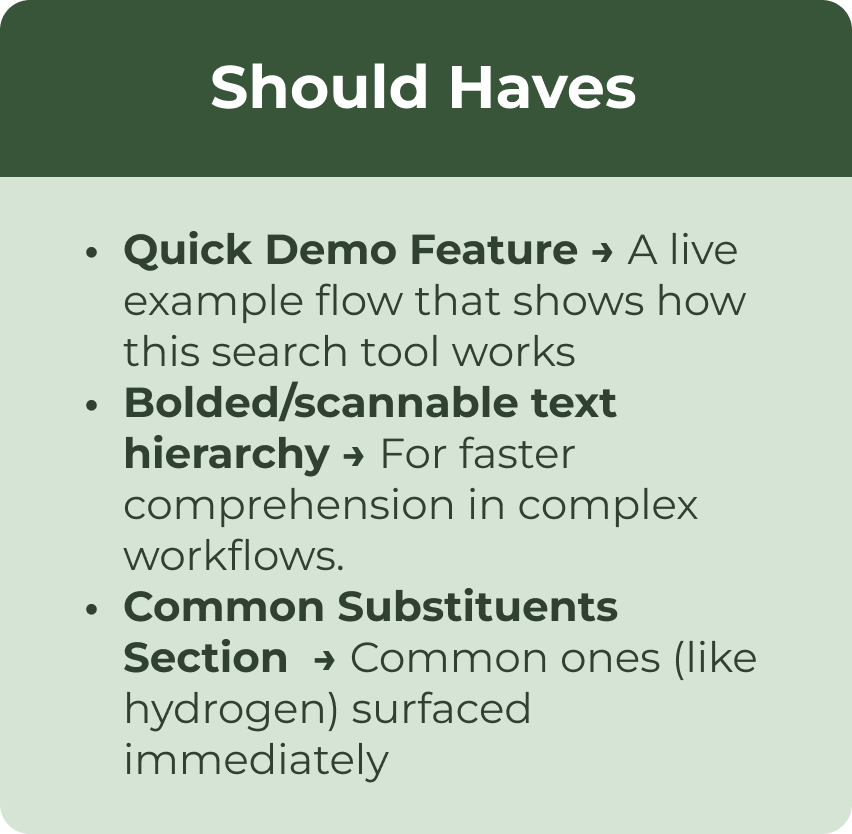 ✅ Faster selection: Search bar and onboarding directions for selecting substituents saved ~25 seconds per search flow.