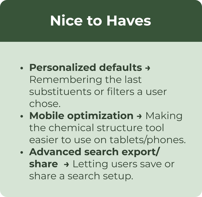 This project reinforced for me that collaboration with stakeholders was crucial to this project. Working closely with researchers and scientists helped me understand the nuances of chemical structure search, while feedback from product managers and engineers grounded my designs in feasibility. Each perspective brought clarity: researchers highlighted usability pain points, PMs ensured alignment with Porta Sophia’s goals, and engineers revealed technical constraints that shaped what could realistically be built.